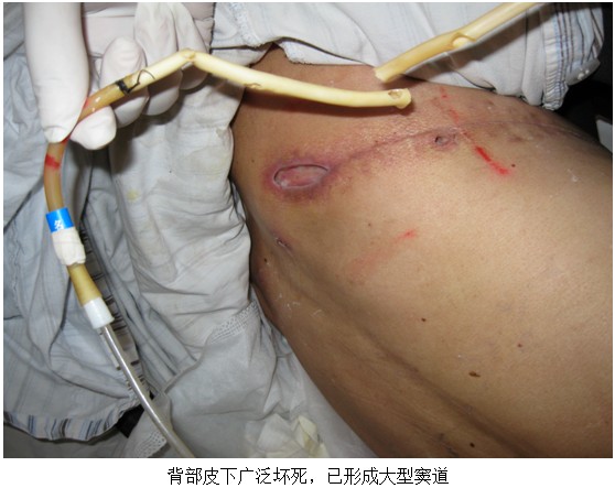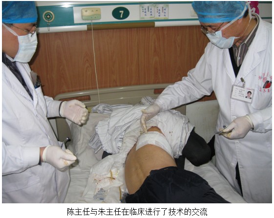 2013年元月15日,三門峽市黃河醫(yī)院外科朱凱主任邀請(qǐng)中國(guó)中西醫(yī)結(jié)合學(xué)會(huì)燒傷專業(yè)委員會(huì)委員、北京美寶燒傷創(chuàng)瘍研究所臨床部主任陳全喜來到黃河醫(yī)院外科會(huì)診右側(cè)背部肋下廣泛肌肉壞死(已在外省治療9個(gè)月,因連續(xù)發(fā)熱不退,轉(zhuǎn)黃河醫(yī)院外科)的高齡危癥病人。