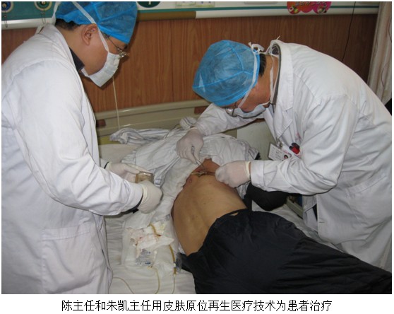 朱凱主任說:“原來只知道MEBO治療燒傷,不知道還有其他用途?!标愔魅谓o病人做了清創(chuàng)術(shù),并用人體皮膚原位再生醫(yī)療技術(shù)治療(見圖片)。兩天后,病人不再發(fā)燒,體溫由40℃降至37℃。目前用人體皮膚原位再生醫(yī)療技術(shù)繼續(xù)治療中,詳細(xì)請(qǐng)看下期報(bào)道。