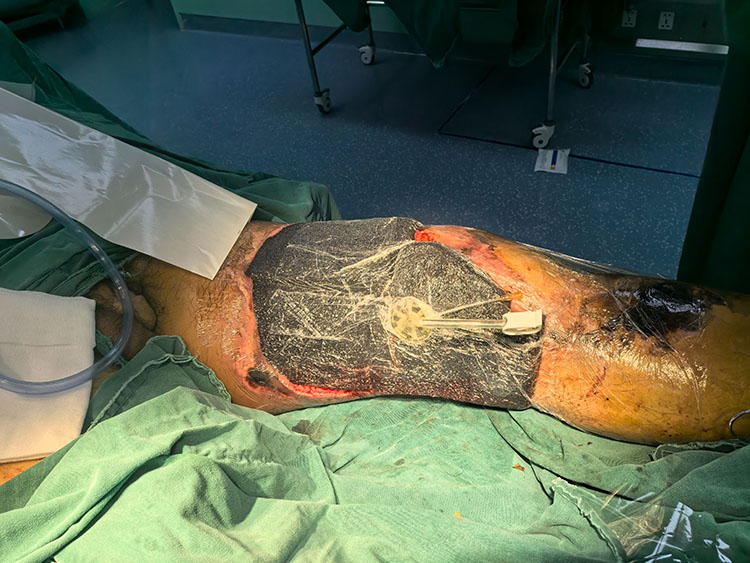 10月10日,應(yīng)長治市人民醫(yī)院急診邀請,《中國燒傷創(chuàng)瘍雜志》常務(wù)編委、燒傷創(chuàng)瘍再生醫(yī)療技術(shù)臨床專家趙瑞慶,會診一例裝載機碾軋傷工人。次日在全麻下行雙下肢大腿內(nèi)側(cè),外側(cè)壞死組織清創(chuàng)術(shù),事后使用vsd裝置,術(shù)后制定了詳細(xì)的治療方案。