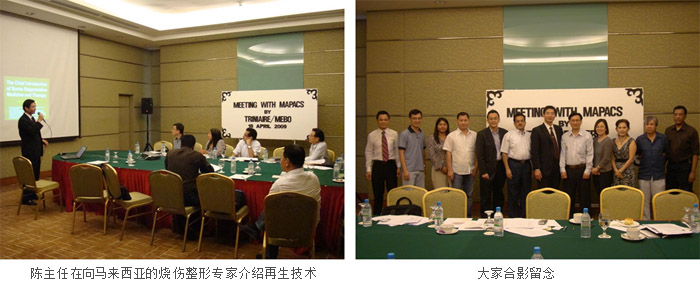 2009年4月18日,馬來(lái)西亞2009年燒傷整形外科常務(wù)委員會(huì)議在吉隆坡Boulevard Hotel召開(kāi),參加會(huì)議的有來(lái)自各州、省、市的重要的燒傷、整形專(zhuān)家約15人。陳永翀主任應(yīng)邀參加會(huì)議,并以“The chief introduction of burns regenerative medicine and therapy”為題進(jìn)行專(zhuān)題報(bào)告,在陳主任的30分鐘的演講中,向各位燒傷整形專(zhuān)家闡述了全厚皮燒傷通過(guò)激活潛能再生細(xì)胞轉(zhuǎn)化為干細(xì)胞,然后利用干細(xì)胞培養(yǎng)再生技術(shù)實(shí)現(xiàn)原位再生復(fù)原皮膚器官的過(guò)程,同時(shí)向大家展示了眾多的大面積特重度燒傷的臨床病例,大家聽(tīng)后非常興奮和激動(dòng),各位專(zhuān)家爭(zhēng)先恐后地舉手提問(wèn),陳主任和助手們則逐一進(jìn)行解答,大家還紛紛詢問(wèn)何時(shí)能夠買(mǎi)到MEBO和引進(jìn)該技術(shù),提問(wèn)和討論階段占了1個(gè)半小時(shí)。最后,燒傷學(xué)會(huì)主席Dr. Peter Wong向陳永翀主任發(fā)出邀請(qǐng),邀請(qǐng)陳主任出席2010由馬來(lái)西亞燒傷學(xué)會(huì)主辦的在馬來(lái)西亞Kuching市召開(kāi)的亞洲燒傷整形大會(huì)并做專(zhuān)題演講。