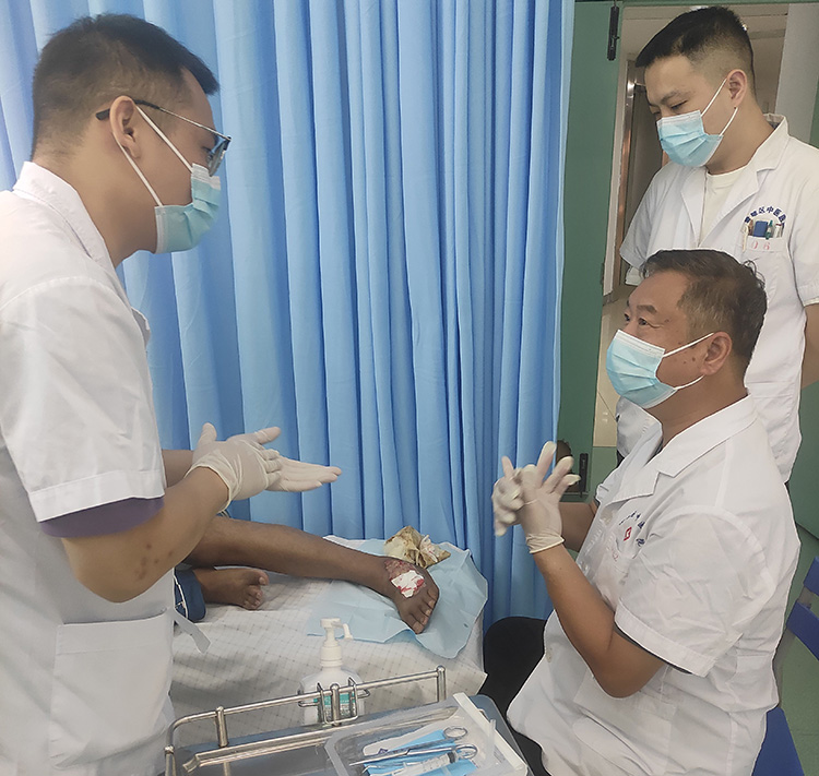2024年9月22日, 應(yīng)黃江區(qū)中醫(yī)院外科葉峰主任邀請,《中國燒傷創(chuàng)瘍雜志》編委、燒傷創(chuàng)瘍再生醫(yī)療技術(shù)臨床專家張強來到該院會診,對一例腳部筋骨外露的透析患者現(xiàn)場示范換藥,講解換藥細節(jié),后與科室醫(yī)生就臨床中遇到的慢性創(chuàng)面的處理做了交流,此次活動極大增進了大家對再生醫(yī)療技術(shù)的了解,增強了運用技術(shù)治療慢性創(chuàng)面的信心!