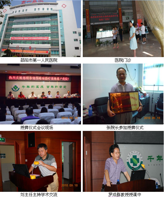2010年9月18日8時,邵陽市第一人民醫(yī)院隆重舉行了中國中西結(jié)合學會燒傷專業(yè)委員會邵陽市燒傷治療培訓基地授牌儀式。本次儀式由該院范副院長主持,該院張院長致辭,中國中西醫(yī)結(jié)合學會燒傷專業(yè)委員會委員、臨床醫(yī)療部金黨軍主任宣讀了關(guān)于批準成立《中國中西結(jié)合學會燒傷專業(yè)委員會邵陽市燒傷治療培訓基地》的批復,邵陽市政府秘書長,市衛(wèi)生局領(lǐng)導,市學會秘書長分別致辭祝賀。湖南省醫(yī)學會劉祖貞秘書長參加了授牌儀式并為該院授牌。會后邵陽市電視臺在晚間新聞做了系統(tǒng)報道,介紹了燒傷皮膚再生醫(yī)療技術(shù)近二十幾年來在湖南省推廣應用的情況;并對邵陽市第一人民醫(yī)院積極引燒傷皮膚再生醫(yī)療技術(shù)這一進先進的技術(shù),造福百姓給與了充分肯定。湖南省醫(yī)學會劉祖貞秘書長在致辭中特別強調(diào)了邵陽市人民醫(yī)院一定要發(fā)揮區(qū)域龍頭作用,盡快掌握徐榮祥教授發(fā)明的新技術(shù)、新成果,使邵陽地區(qū)的新技術(shù)、新成果推廣普及工作再上一個新臺階,福祉基層百姓。