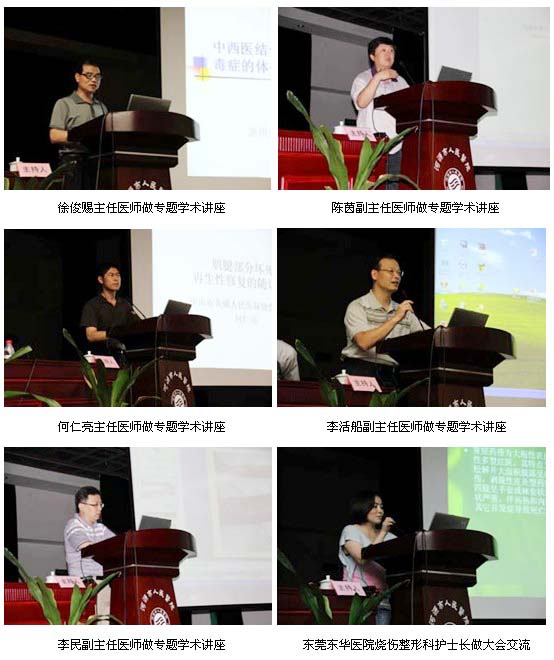 王洪生研究員首先以“燒傷皮膚原位再生復原技術在重度以上燒傷系統(tǒng)治療的要點”為題進行了專題學術講座;隨后,唐乾利教授講解了“皮膚潰瘍創(chuàng)面處理的中西醫(yī)基礎與臨床研究近況”;王達利教授講授了“瘢痕疙瘩來源干細胞的生物學特性鑒定”;賀全勇教授講授了“燒傷感染的防治”;譚軍教授講授了“點陣激光治療增生性瘢痕”;張一鳴教授講授了“燒傷瘢痕的外科治療”; 省內專家廣東省中西醫(yī)結合學會燒傷專業(yè)委會副主任委員、中山大學附屬五院燒傷整形科主任辛儉副主任醫(yī)師;廣東省中西醫(yī)結合學會燒傷專委會副主任委員、深圳陽光醫(yī)院院長張華彬主任醫(yī)師;廣東省中西醫(yī)結合學會燒傷專委會副主任委員、深圳市第六人民醫(yī)院梁智主任醫(yī)師;廣東省中西醫(yī)結合學會燒傷專委會副主任委員、廣東醫(yī)學院附屬惠州醫(yī)院(惠州市中心醫(yī)院)燒傷整形科主任徐俊賜主任醫(yī)師;廣東省中西醫(yī)結合學會燒傷專業(yè)委員會常委、深圳市龍崗中心醫(yī)院燒傷整形科主任陳茵副主任醫(yī)師;廣東省中西醫(yī)結合學會燒傷專業(yè)委員會委員、佛山南海人民醫(yī)院燒傷整形科主任李民副主任醫(yī)師;廣東省中西醫(yī)結合學會燒傷專業(yè)委員會常委兼秘書、中山黃圃人民醫(yī)院皮膚與燒傷創(chuàng)瘍科主任何仁亮主任醫(yī)師;廣東省中西醫(yī)結合學會燒傷專業(yè)委員會常委、開平市婦幼保健院院長李活船副主任醫(yī)師分別以“小兒重度燒傷治療”、“皮膚擴張技術在燒傷瘢痕中的運用”、“皮膚圓錐體結構的病理學觀察”、“皮膚微粒皮種植修復大面積燒傷創(chuàng)面”、“中西醫(yī)治療燒傷膿毒癥”為題進行了專題講座。在學術講座中來自國內各省的專家利用大量詳實的圖片資料,重點向與會的專家、學者和醫(yī)護人員講述了燒傷皮膚原位再生復原醫(yī)療技術等中西醫(yī)結合方法在特重度燒傷并發(fā)癥及增生性瘢痕防治方面的進展,由于學術講座重點突出、內容豐富、貼近臨床,方法簡便實用、臨床效果顯著,與會代表反映強烈。學習班結束后,學員們進行了廣泛而深入地交流。