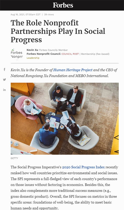 2021年8月16日,美寶集團(tuán)34周年紀(jì)念日,《福布斯》特別刊發(fā)美寶集團(tuán)董事局徐鵬文章——非營利伙伴關(guān)系在社會進(jìn)步中的作用。徐鵬希望通過非營利組織,提高國家的社會進(jìn)步指數(shù)(SPI)。