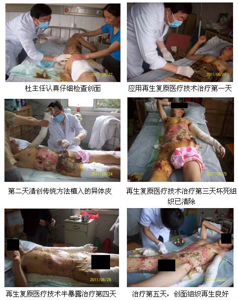 應(yīng)宿州皖北煤電總醫(yī)院燒傷整形科齊國(guó)選主任的邀請(qǐng),中國(guó)中西醫(yī)結(jié)合學(xué)會(huì)燒傷專業(yè)委員會(huì)委員、北京美寶燒傷創(chuàng)瘍研究所臨床部杜福勤主任和學(xué)會(huì)駐安徽省辦事處吳崇巍同志于6月21日~6月27日對(duì)燒傷面積分別為50%TBAS(淺II度~深I(lǐng)I度)、46%TBAS(深I(lǐng)I度~淺III度)、43%TBAS(淺II度為主、混合II度)的三例燒傷患者進(jìn)行會(huì)診,并示范應(yīng)用原位再生復(fù)原技術(shù)為患者換藥治療,同時(shí)介紹了皮膚原位再生復(fù)原醫(yī)療技術(shù)的基礎(chǔ)理論、概念和國(guó)內(nèi)外臨床實(shí)踐經(jīng)驗(yàn),皖北煤電總院應(yīng)用傳統(tǒng)醫(yī)療技術(shù)多年,經(jīng)這次杜主任為大家進(jìn)行臨床示范操作及講解,讓大家體會(huì)到再生復(fù)原科學(xué)技術(shù)的臨床魅力和神奇,在不到一周的示范治療,三例患者均有明顯的治療效果,燒傷面積43%TBAS的患者大部分創(chuàng)面已基本愈合,患者要求帶藥出院在家治療,從患者興奮洋溢的臉上體現(xiàn)出了皮膚原位再生復(fù)原技術(shù)的神奇魅力。