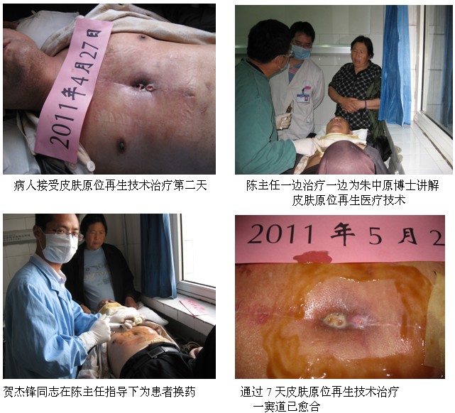 通過(guò)陳主任皮膚原位再生技術(shù)的闡述,在場(chǎng)的會(huì)診專家組成員均被原位再生醫(yī)療技術(shù)深深的折服,最后經(jīng)過(guò)集體會(huì)診研究決定,將該患交給陳全喜主任親自帶領(lǐng)該患的主治醫(yī)師、博士朱中原采用皮膚原位再生醫(yī)療技術(shù)為該患治療。換藥后第七天,患者傷口疼痛明顯減輕,體溫恢復(fù)正常,3個(gè)竇道中,其中一個(gè)竇道已接近愈合,患者正在進(jìn)一步的治療康復(fù)中。