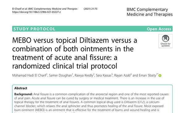 日前,一項(xiàng)由貝魯特美國(guó)大學(xué)醫(yī)學(xué)中心醫(yī)學(xué)博士、首席研究員Eman Sbaity發(fā)起的MEBO與Diltiazem兩種軟膏制劑在急性肛裂治療中的對(duì)比試驗(yàn)研究方案在BMC Complementary and Alternative Medicine(BMC補(bǔ)充與替代醫(yī)學(xué))雜志發(fā)表。該研究方案已在世界衛(wèi)生組織WHO試驗(yàn)注冊(cè)數(shù)據(jù)集備案,以為該研究方案提供信息存檔、訪問(wèn)查詢、進(jìn)展追蹤及研究評(píng)估等。