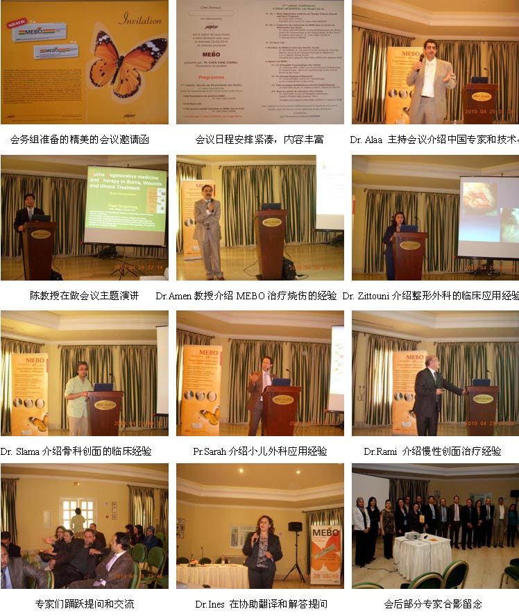 3、2010年4 月29日,突尼斯國家級燒傷、創(chuàng)傷外科學(xué)術(shù)交流會在Acropole Hotel會議室舉辦, 學(xué)術(shù)交流會有Dr.Alaa Haleil主持,來自全國3個主要城市的10多家醫(yī)院的30多名燒傷、整形、創(chuàng)傷外科醫(yī)師參加了學(xué)術(shù)交流會,陳教授以“Burns Regenerative Medicine and Therapy in Burns, Wounds and Ulcers treatment” 為題做了主題演講。另外,還有6名專家教授在交流會上介紹了他們近年來應(yīng)用MEBO治療燒傷、創(chuàng)傷和潰瘍的臨床經(jīng)驗,學(xué)術(shù)氛圍濃厚,大家都覺得這是一次非常難得的交流和學(xué)習(xí)的機(jī)會,希望以后每次學(xué)術(shù)年會都有新技術(shù)和好經(jīng)驗的介紹和交流。