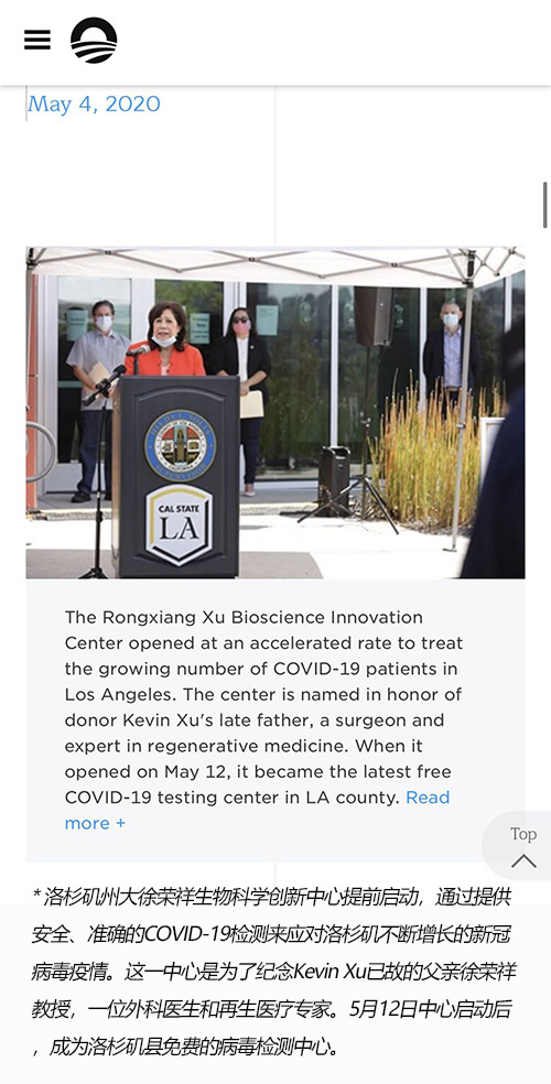 新冠肺炎疫情期間,洛杉磯州大徐榮祥生物科學(xué)創(chuàng)新中心設(shè)立為了新冠肺炎免費檢測點。奧巴馬基金會將這一充滿溫情的信息與系列或感人或激勵的暖心小故事一起登于官網(wǎng),在艱難時刻傳遞希望與愛。