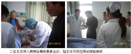 講課結(jié)束后二位主任深入病房和鄉(xiāng)鎮(zhèn)衛(wèi)生院會診,陸主任親自為褥瘡患者換藥,指導(dǎo)示范創(chuàng)瘍貼的換藥深受患者家屬和醫(yī)護人員的歡迎。