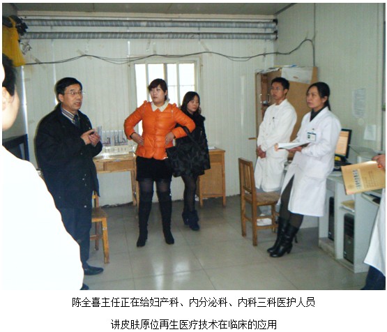 陳全喜主任在培訓(xùn)中強(qiáng)調(diào)說,人體皮膚原位再生醫(yī)療技術(shù)是中國生命科學(xué)家徐榮祥教授創(chuàng)立的,皮膚原位再生醫(yī)療技術(shù)的原理是讓創(chuàng)面立體式暴露在一個(gè)生理濕潤環(huán)境內(nèi),自動(dòng)液化排除壞死皮膚,保護(hù)殘存皮膚細(xì)胞再生復(fù)原創(chuàng)面。并就皮膚原位再生醫(yī)療技術(shù)實(shí)現(xiàn)皮膚原位再生修復(fù)的原理進(jìn)行了詳細(xì)的講解。