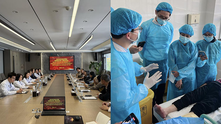 23日,代表團抵達北京市豐臺區(qū)中醫(yī)醫(yī)院,醫(yī)院燒傷整形與創(chuàng)面修復科組織了內(nèi)容豐富的參觀與學術(shù)交流活動。上午,代表團參觀了病區(qū)與門診,并觀摩了急慢性創(chuàng)面的再生醫(yī)療技術(shù)規(guī)范換藥操作。隨后,醫(yī)院醫(yī)護人員圍繞糖尿病足潰瘍、大面積燒傷、褥瘡等臨床案例進行了詳細講解。來自印尼的兩位醫(yī)生也分享了該技術(shù)在印尼的臨床應用經(jīng)驗,引發(fā)了現(xiàn)場的積極討論,拓寬了雙方在創(chuàng)面管理領(lǐng)域的理解與交流。