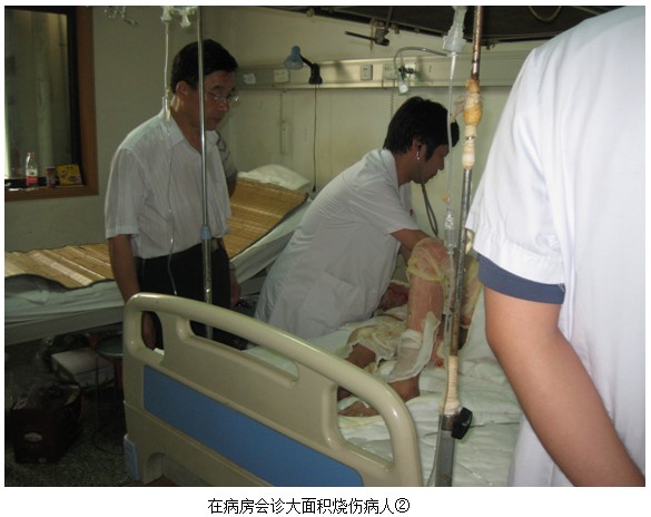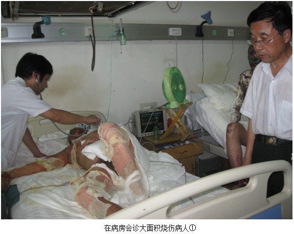 陳全喜主任到達(dá)油田醫(yī)院后,張主任介紹,該院來(lái)了一位大面積燒傷病人,燒傷面積87%,已經(jīng)2天了,并采用MEBT/MEBO進(jìn)行治療,并邀請(qǐng)陳主任確定是否達(dá)到了MEBO技術(shù)的要求。陳主任立即趕往病房,病人平穩(wěn)地躺在病床上,全身用MEBO油沙半暴露療法。經(jīng)檢查,各項(xiàng)指標(biāo)正常。會(huì)診后,陳主任較為滿意,陳主任與張主任確定將在科室晨起開(kāi)會(huì)時(shí),做講座。