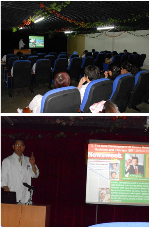 北京片區(qū)在陳永翀主任幫助下聯(lián)絡(luò)醫(yī)院科教科,于在2012年6月14號下午,在該院培訓(xùn)大廳進行再生技術(shù)和產(chǎn)品的繼續(xù)教育培訓(xùn),參加科室有外科、骨科、兒科、糖尿病科的三十多名醫(yī)護人員。陳永翀主任所講內(nèi)容不僅涉及燒傷創(chuàng)面修復(fù),還在糖尿病潰瘍、褥瘡方面結(jié)合病例進行講解,醫(yī)生們被再生技術(shù)的神奇療效深深吸引,會場學(xué)習(xí)氣氛濃厚,培訓(xùn)結(jié)束后糖尿病科的醫(yī)生與陳主任進行了更細致的討論。