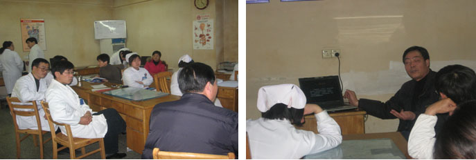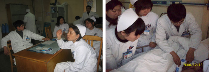 醫(yī)護人員認真討論臨床常見的問題                                   徐建華主任在查房檢查創(chuàng)瘍患者