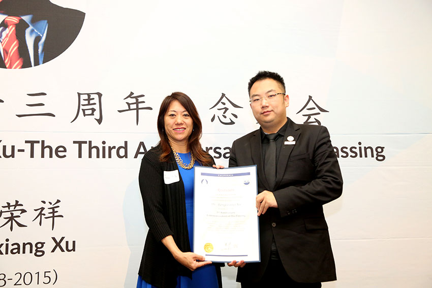 加州平稅局委員馬世云女士希望用徐大夫的科學(xué)技術(shù)提高更多人的生命質(zhì)量,并將他的研究方法發(fā)揚(yáng)光大,讓這個(gè)世界因他而變得更美好。馬世云為徐鵬頒發(fā)了徐大夫逝世三周年紀(jì)念證書,以表感念。