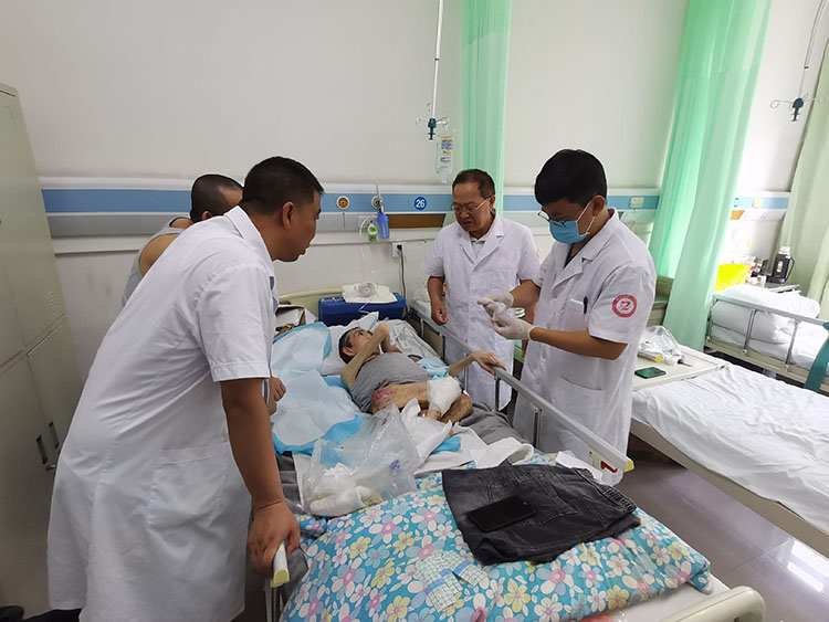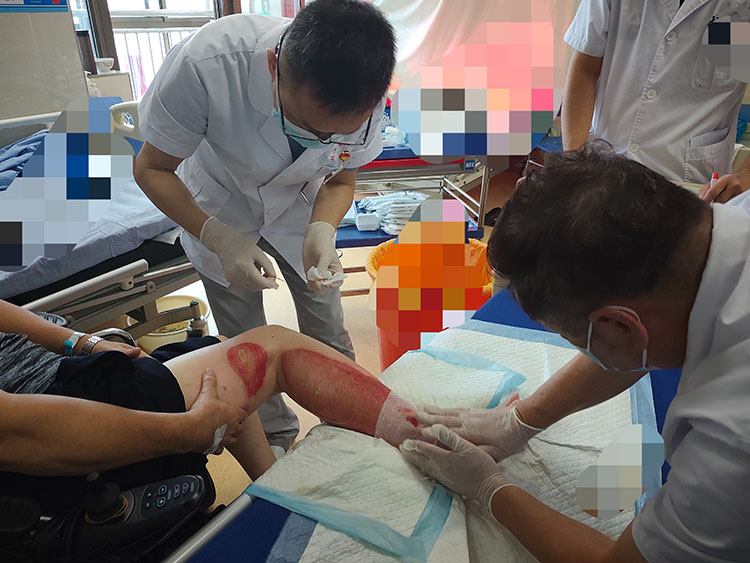 7月12日,應山西國藥同煤二醫(yī)院邀請,《中國燒傷創(chuàng)瘍雜志》常務編委、燒傷創(chuàng)瘍再生醫(yī)療技術臨床專家趙瑞慶在該醫(yī)院對收治的19例慢創(chuàng)患者進行逐一查房檢查,針對其中8例患者親自示范處置演示,在院期間還為一名截癱礦工行骶尾部壓瘡皮簇種植術。