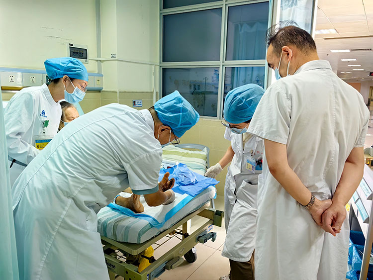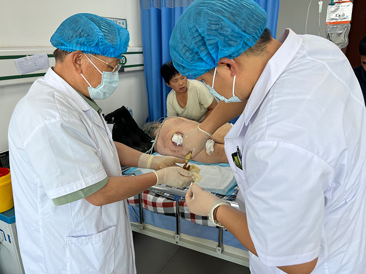 2025年7月12日,中國中西醫(yī)結合學會燒傷專業(yè)委員會常務委員、《中國燒傷創(chuàng)瘍雜志》副總編輯王洪生,受邀到漳州市龍海區(qū)榜山衛(wèi)生院會診一例糖尿病足患者,王教授現(xiàn)場教學,親自示范清創(chuàng)和換藥,得到了醫(yī)護人員和患者家屬的一致好評!
