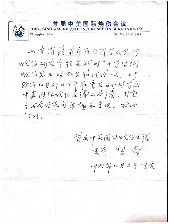 3、1985年10月,發(fā)明人出席重慶首屆中美國際燒傷會議,發(fā)表了濕潤燒傷膏的研究論文,盛志勇主持會議,引起與會者重視,大會主席黎鰲教授寫出證明信函,望山東省支持徐榮祥的燒傷研究,隨之濟(jì)南市衛(wèi)生局誹謗是假信。(原件一直保留,只給他們看,沒交給他們,以下是原件)從此矛盾激化。衛(wèi)生局黨委發(fā)出最后通知,1986年8月31日,在局黨委書記辦公室寫了辭職報(bào)告(1986年9月1日,國家發(fā)布科技人員可辭職的文件生效日)。