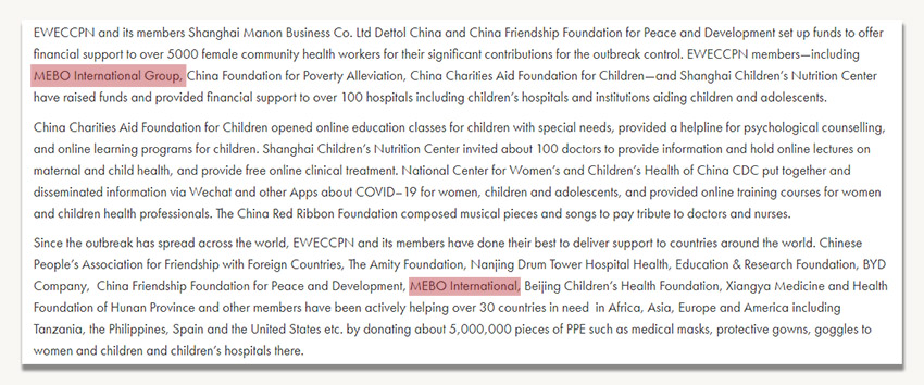 2020年6月16日,中國人民對外友好協(xié)會前會長、聯(lián)合國“每個婦女 每個兒童”高級指導(dǎo)委員會成員李小林署名文章《聯(lián)合國“每個婦女 每個兒童”中國合作伙伴網(wǎng)絡(luò)積極行動抗擊疫情》在聯(lián)合國“每個婦女 每個兒童“官網(wǎng)首頁刊登。文章指出中國伙伴網(wǎng)絡(luò)在新冠肺炎疫情期間,快速行動,充分發(fā)揮和匯聚各成員優(yōu)勢資源和力量,通過捐贈物資、募集善款、開設(shè)云課堂、召開經(jīng)驗分享視頻會議等多種形式助力中國和全球的婦女兒童抗擊疫情,其中特別提到了美寶集團在這次抗疫行動中的突出表現(xiàn)。