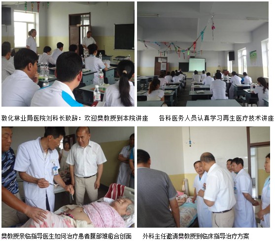 會(huì)議結(jié)束后,應(yīng)普外科張主任邀請,樊兆宗教授來到病房會(huì)診了兩例患者:一例褥瘡病人,另一例為腹部難愈合創(chuàng)面,產(chǎn)生竇道,樊教授結(jié)合病人情況再次講解了如何運(yùn)用再生醫(yī)療技術(shù)來進(jìn)行規(guī)范治療。本次學(xué)術(shù)活動(dòng)對再生醫(yī)療技術(shù)在敦化林業(yè)局職工醫(yī)院的推廣工作打下了堅(jiān)實(shí)的基礎(chǔ)。