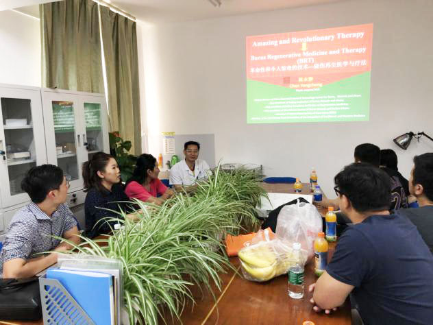 9月11日上午,蒙古來(lái)訪(fǎng)專(zhuān)家一行來(lái)到燒傷創(chuàng)瘍科病房區(qū)參觀(guān)交流,參觀(guān)了再生醫(yī)學(xué)療法治療糖尿病足、褥瘡、癌性創(chuàng)面及兩例85%以上的大面積燒傷患者在內(nèi)共三十多位患者的治療情況。隨后去門(mén)診了解門(mén)診患者的病情及就診情況。下午,陳永翀教授在會(huì)議室以課件形式給來(lái)訪(fǎng)專(zhuān)家們講解了再生醫(yī)學(xué)療法的操作規(guī)范及多病種病例,雙方就技術(shù)應(yīng)用進(jìn)行了深入的交流。
