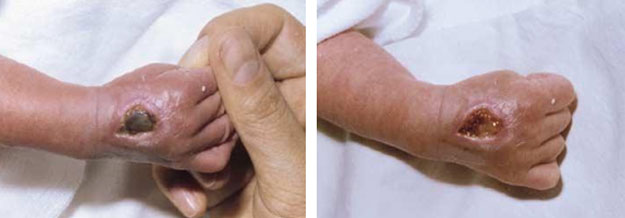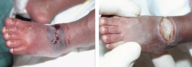 梨花女子大學(xué)木洞醫(yī)院于2003年12月至2004年3月期間收治了5例早產(chǎn)兒,在該院的新生兒重癥監(jiān)護(hù)病房接受治療,治療前其父母均簽訂了知情同意書(shū),此研究中的一切程序都是嚴(yán)格遵守倫理學(xué)標(biāo)準(zhǔn)以及赫爾辛基宣言而執(zhí)行。患兒胎齡從28+4w~35+6w,平均胎齡為31+2w。平均體重從1140g~2680g,平均1930g?;疾r(shí)間為出生后的17d~50d,平均32d。治療方法使用抗生素加MEBO(美寶濕潤(rùn)燒傷膏)混合劑對(duì)創(chuàng)面進(jìn)行局部治療,每天換藥1~2次,應(yīng)用再生醫(yī)療技術(shù)治療患兒創(chuàng)面具有創(chuàng)面愈合快、愈合質(zhì)量高、無(wú)任何疤痕生成等顯著療效。