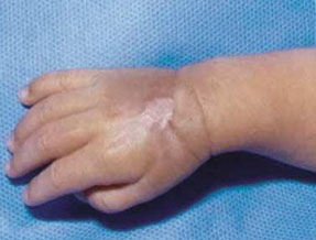胎齡29+1w,出生后36d,因12.5%全胃腸外營(yíng)養(yǎng)液以及10%英脫利匹特液的滲漏,導(dǎo)致早產(chǎn)兒右足足背出現(xiàn)皮下水腫。創(chuàng)面腫脹呈淡藍(lán)色并伴有結(jié)痂(圖1. A)。采用再生醫(yī)療技術(shù)治療四周后,創(chuàng)面全部無(wú)瘢痕愈合,只有部分色素沉著(圖1.B)。于出生后126d,由于輸血,在右手手背處出現(xiàn)1cmX1 cm的全厚皮壞死損傷(圖2.A)。使用同樣的方法對(duì)創(chuàng)面進(jìn)行處理。治療5w后,傷口全面愈合,除留有一小處攣縮外,無(wú)任何功能性異常(圖2.C)。