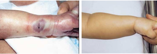 患兒胎齡33+1w,出生18d后,在左前臂進(jìn)行12.5%的全腸胃外營(yíng)養(yǎng)輸液中發(fā)生滲漏,左前臂出現(xiàn)皮下水腫和局部組織壞死(圖3),創(chuàng)面出現(xiàn)直徑為0.5cm X 1cm的部分厚皮缺損。在水腫出現(xiàn)的一個(gè)小時(shí)內(nèi),使用再生技術(shù)處理,一個(gè)月后,創(chuàng)面全部愈合。