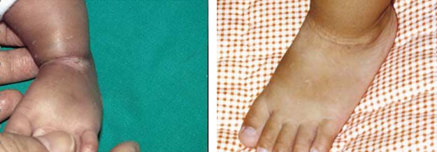 圖5.A左足輸注營(yíng)養(yǎng)液液滲漏性損傷                     圖5.B應(yīng)用再生醫(yī)療技術(shù)治療2年后