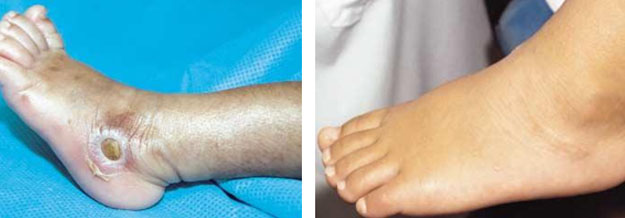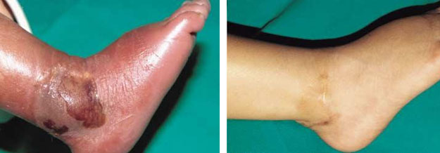 圖6.A 左足外側(cè)營(yíng)養(yǎng)液滲漏性損傷的表現(xiàn)              圖6.B 應(yīng)用再生醫(yī)療技術(shù)治療20個(gè)月后