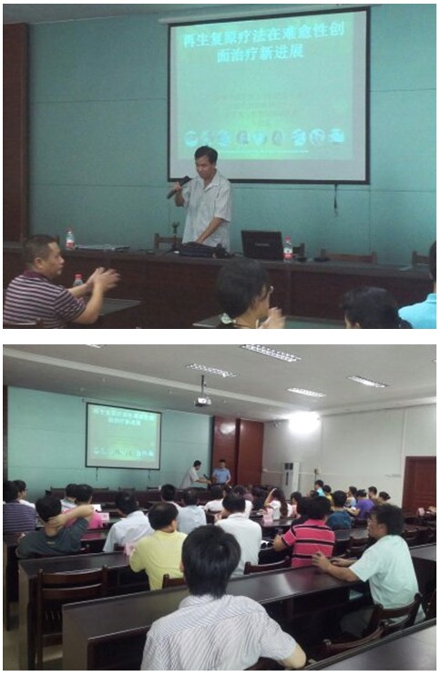 2012年7月30日,應(yīng)該院熱情的邀請(qǐng),中國(guó)中西醫(yī)結(jié)合學(xué)會(huì)燒傷專業(yè)委員會(huì)常委兼秘書、《中國(guó)燒傷創(chuàng)瘍雜志》副總編輯、北京美寶燒傷創(chuàng)瘍研究所副所長(zhǎng)、第二臨床研究部主任王洪生研究員來到該院,作學(xué)術(shù)和技術(shù)上的交流和探討。下午3時(shí),在醫(yī)務(wù)科潘主任的主持下會(huì)議開始,全院職工各科室70余名相關(guān)專業(yè)的醫(yī)護(hù)人員到會(huì)認(rèn)真學(xué)習(xí)傾聽王主任 “再生復(fù)原療法在深度燒傷及難愈性創(chuàng)面治療新進(jìn)展”專題學(xué)術(shù)講座,在學(xué)術(shù)講座中,王主任結(jié)合大量真實(shí)的臨床病例圖片和圖像,針對(duì)不同深度的燒傷創(chuàng)面及各類難愈性創(chuàng)傷、潰瘍創(chuàng)面的規(guī)范化處理方法與技巧、注意事項(xiàng)等進(jìn)行了細(xì)致地講解,強(qiáng)調(diào)創(chuàng)面處理要大膽清創(chuàng)、減壓、去除壞死組織,并保持創(chuàng)面生理的濕潤(rùn)環(huán)境,實(shí)現(xiàn)創(chuàng)面的再生復(fù)原,并建議對(duì)病人深達(dá)真皮層以下愈合后創(chuàng)面應(yīng)進(jìn)行防疤處理治療.會(huì)議得到會(huì)議人員的高度贊揚(yáng)。