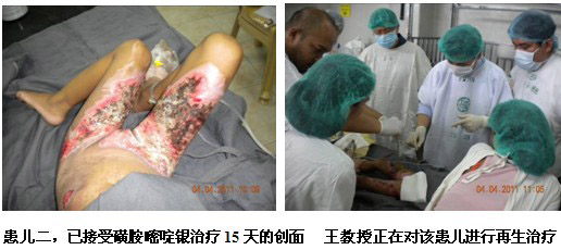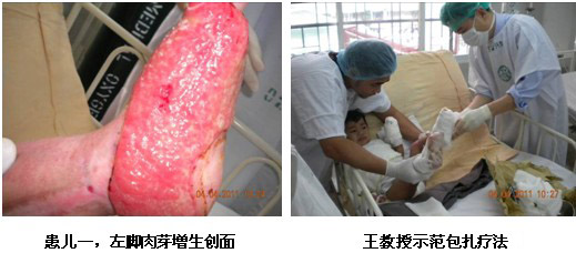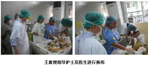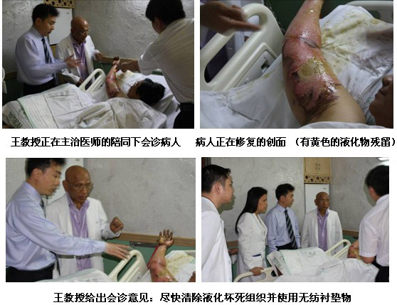 雖然培訓結束了,但是一名外科高年資醫(yī)生盛情邀請王洪生教授到病房會診一名他們正在用再生醫(yī)學技術治療的燒傷患者。該病人是上肢深II度和I度混合燒傷患者,正在接受經典的暴露療法來治療。來到病房,當王教授看到黃色的液化物仍殘留在創(chuàng)面時,他立即指出液化的壞死組織需要及時清除,并且強調需要使用無紡布的襯墊物,而不是現(xiàn)在所使用的棉質被單。因為只有這樣才能保證創(chuàng)面濕潤環(huán)境的保持,促進表皮干細胞的再生。主治醫(yī)生和患者對王主任的到來,表示熱烈歡迎,并非常感謝王主任的指導。他們表示馬上為患者換藥并清潔創(chuàng)面。