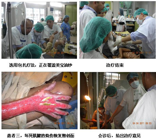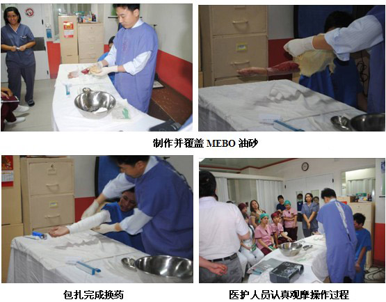 隨后王教授來到病房會診一名褥瘡患者,并演示換藥程序。該病人的壓瘡在會診前有壞死腐皮沒有清除。王主任親自示范如何徹底清創(chuàng),并展示包扎療法的操作過程。有一名醫(yī)生表示,原先他只是涂上燒傷膏,然后包扎,并沒有覆蓋MEBO油砂,此次培訓會后,他知道了并規(guī)范了包扎療法的使用。整個會診及換藥過程持續(xù)了35分鐘,醫(yī)生們表示收益匪淺,雖然使用了MEBT/MEBO很多年,但是仍然還有很多需要深入學習并實踐的知識。