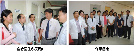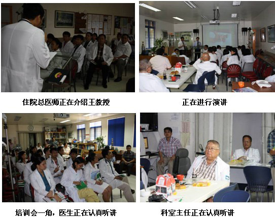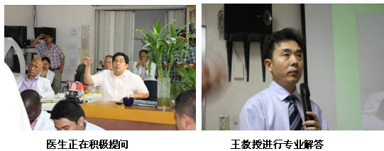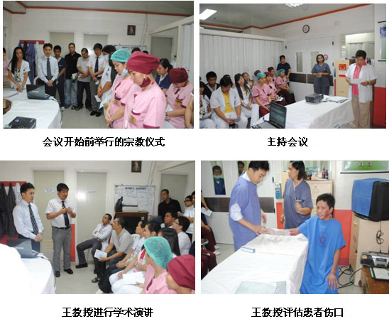 隨后來到該院普外科會議室,對普外科醫(yī)護人員進行再生醫(yī)學技術在慢性創(chuàng)瘍病例上的展示及治療藥店。各種慢性創(chuàng)面包括糖尿病足,褥瘡,動、靜脈潰瘍。共計30名外科及燒傷科醫(yī)生參加。該院院長也來到會議室,與王主任進行交流,并參加了整個培訓來充分了解再生醫(yī)學技術。有一名醫(yī)生Pradez Sapkofa,他是菲律賓人,但曾經在山東學醫(yī)6年,能熟練使用中文。會后,他用中文親切地稱王洪生教授為王老師,并緊握王教授的雙手說真是神奇的技術并為中國感到驕傲和自豪。