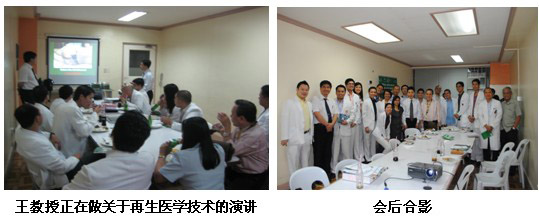 4. 4月7日上午10點,王教授一行來到VMMC (Veteran Memorial Medical Center,http://en.wikipedia.org/wiki/Veterans_Memorial_Medical_Center)醫(yī)院普外科進行醫(yī)療開發(fā)。該院是一家大型的私立醫(yī)院,并從2007年開始使用MEBT/MEBO技術治療各種創(chuàng)瘍患者。共計8名醫(yī)生和16名護士參與培訓會。培訓會持續(xù)30分鐘,主要介紹了再生醫(yī)學技術在慢性創(chuàng)面上的使用及三種換藥方式的規(guī)范操作。會后提問持續(xù)了15分鐘。問題集中在:1.糖尿病足的換藥程序;2.MEBO燒傷膏的藥用成分等。有一名重點醫(yī)生在會后強調,他使用此技術和產品取得了很好的臨床效果,他正在勸服其他醫(yī)生和醫(yī)院使用該技術來幫助更多的病患。另一名醫(yī)生正在做相關的臨床研究,對比再生醫(yī)學技術和傳統(tǒng)西方醫(yī)學的療效。王教授建議他給中國燒傷創(chuàng)瘍雜志社投稿。