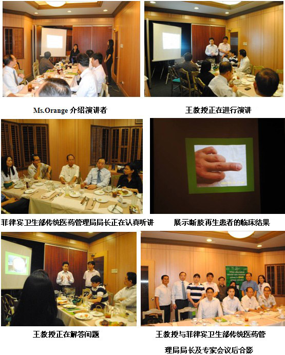 然后,王教授一行又來到CGH (Chinese General Hospital http://en.wikipedia.org/wiki/Chinese_General_Hospital_College_of_Nursing_and_Liberal_Arts), 醫(yī)院普通外科,該院是華僑開設的私人醫(yī)院,中文名字叫崇仁中心醫(yī)院。該院是第一次做醫(yī)療開發(fā),準備在培訓會后引進MEBT/MEBO。主要內容涉及MEBO適應癥典型案例介紹和如何使用MEBT/MEBO技術和產品。會后,該科室主任詢問此技術在糖尿病足治療的具體步驟。晚上6點,與菲律賓衛(wèi)生部傳統(tǒng)醫(yī)藥管理局局長及8名來自不同醫(yī)院和科室的主任進行圓桌交流和會談,有一名醫(yī)生第二次見面,其他均為第一次,但是他們都正在使用美寶治療病人。主要涉及的話題為MEBO適應癥典型案例介紹和如何使用MEBT/MEBO技術和產品。整個交流從提問環(huán)節(jié)開始,然后有針對性地進行講課,整個過程直到晚上11點才結束。醫(yī)生的主要問題集中在1.該技術如何抗感染;2. 如何防治瘢痕增生;3. 骨髓開窗術后很容易發(fā)生骨髓炎,再生醫(yī)學技術是如何防治的。會后醫(yī)生非常滿意,對MEBT/MEBO所達到的臨床效果非常滿意。