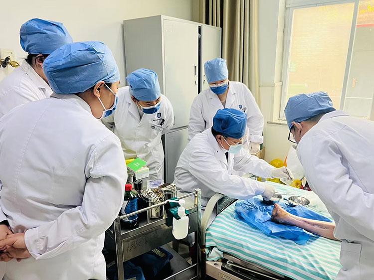 4月18日,應(yīng)滄州市中西醫(yī)結(jié)合醫(yī)院之邀,《中國燒傷創(chuàng)瘍雜志》常務(wù)編委、燒傷創(chuàng)瘍再生醫(yī)療技術(shù)臨床專家趙瑞慶,深入肛腸、脈管炎病區(qū)會(huì)診了糖足潰瘍、脈管炎、壓瘡、足指混合感染等患者,并在科里進(jìn)行了再生技術(shù)培訓(xùn),結(jié)合目前準(zhǔn)備開展燒傷治療進(jìn)行了技術(shù)交流,事后與肛腸科李主任治療肛腸疾病、肛腸專業(yè)的健康發(fā)展做了深入的交流探討。