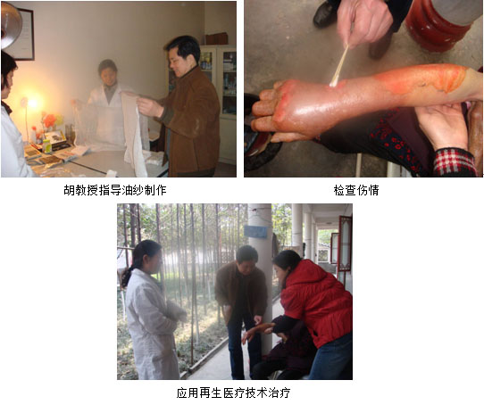 2009年2月27日,成都市敬老院一位老人不慎被燙傷,經(jīng)醫(yī)生診斷為:深Ⅱ度燒傷,15%TBSA。因敬老院醫(yī)務(wù)人員缺乏燒燙傷的救治經(jīng)驗,他們就向臨近的四川省中西醫(yī)結(jié)合學會咨詢救治方案。省學會李成林秘書長了解情況后,立即致電中國中西醫(yī)結(jié)合學會燒傷專業(yè)委員會胡教授,請其協(xié)助救治。胡教授聞訊立即和燒傷專業(yè)委員會四川辦事處工作人員帶上再生醫(yī)療藥品在秘書長的陪同下及時趕到了成都市敬老院,現(xiàn)場指導敬老院的醫(yī)務(wù)人員運用再生醫(yī)療技術(shù)和藥品對燙傷的老人進行救治,并在敬老院醫(yī)務(wù)室對醫(yī)護工作人員進行了再生醫(yī)療技術(shù)的講解和要點技術(shù)的再次示范,同時告訴醫(yī)務(wù)人員再生醫(yī)療技術(shù)還能廣泛的應(yīng)用于褥瘡、皮膚潰瘍等創(chuàng)瘍性疾病,如治療過程中還需要其它技術(shù)支持可隨時聯(lián)系。敬老院的醫(yī)護人員十分感謝胡教授將這項先進的再生醫(yī)療技術(shù)教給他們,并表示要用這項技術(shù)為更多的老年人解除疾痛!