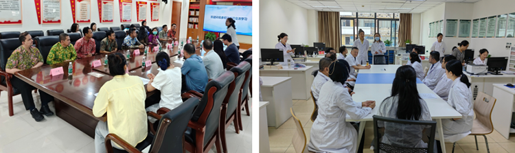 8月27日,訪問團(tuán)再次前往燒傷創(chuàng)瘍科病房,在王鄉(xiāng)寧主任的帶領(lǐng)下對(duì)患者進(jìn)行查房。通過床旁講解,訪問團(tuán)了解到了進(jìn)行多技術(shù)聯(lián)合治療的最佳時(shí)機(jī)以及輔助治療對(duì)促進(jìn)創(chuàng)面愈合的良好效果。病房參觀結(jié)束后,雙方醫(yī)生圍坐學(xué)習(xí)室,來自RSUD Dr. Soetomo醫(yī)院整形外科的Agus Santoso Budi主任及來自RSUP Dr. Sardjito醫(yī)院整形外科的Rianto Noviady Ramli主任分享了在印尼當(dāng)?shù)貞?yīng)用再生醫(yī)療技術(shù)治療燒傷的經(jīng)驗(yàn),通過與中方專家的交流,代表團(tuán)更加深入的了解到了如何在臨床中正確應(yīng)用該技術(shù)的治療原則。