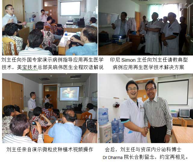 2012-9-17---2012-9-23日,為了進(jìn)一步了解和學(xué)習(xí)燒傷再生醫(yī)學(xué)在中國臨床上的應(yīng)用,來自印度尼西亞、馬來西亞和蒙古3個(gè)國家的醫(yī)生一行8人 在美寶國際市場(chǎng)集團(tuán)和印尼代理商Arif hamsah等多方前期制定的計(jì)劃安排下,齊聚廣州中西醫(yī)結(jié)合醫(yī)院參觀學(xué)習(xí)美寶再生醫(yī)學(xué)技術(shù),受到了醫(yī)院院長(zhǎng)以及科室主任和醫(yī)生們熱烈歡迎。