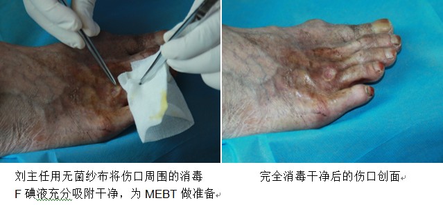 1部分:查房 9.17 日早上,9點(diǎn)準(zhǔn)時(shí),作完雙方醫(yī)生自我介紹之后,美寶國際集團(tuán)技術(shù)總部吳曉偉醫(yī)生帶著3國醫(yī)生在劉平洪主任的帶領(lǐng)下,開始病房查房,首先第1個(gè)病人是1位60歲糖尿病足潰瘍伴支氣管擴(kuò)張感染的老年男子 ,目前我們看到他右下足的傷口,是已經(jīng)經(jīng)過3周的美寶再生技術(shù)治療后,傷口快要痊愈的情景。