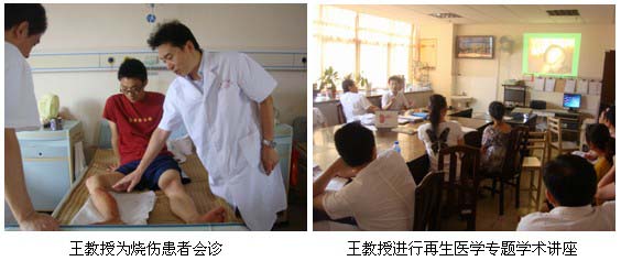 在學(xué)術(shù)講座開(kāi)始前,王教授應(yīng)邀首先深入該醫(yī)院外一科(包括:燒傷整形科、神經(jīng)外科、泌尿外科)病房為一名排氣管燒傷患者會(huì)診,指導(dǎo)規(guī)范的創(chuàng)面處理方法。隨后王教授應(yīng)邀在外一科醫(yī)生辦公室進(jìn)行了“再生復(fù)原療法在燒傷及難愈性創(chuàng)面臨床規(guī)范化處理”的專題學(xué)術(shù)講座,該醫(yī)院主管副院長(zhǎng)兼外一科主任黃永東主任醫(yī)師主持并全程聆聽(tīng)了學(xué)術(shù)講座,該醫(yī)院醫(yī)務(wù)科長(zhǎng)也參加了學(xué)術(shù)講座。