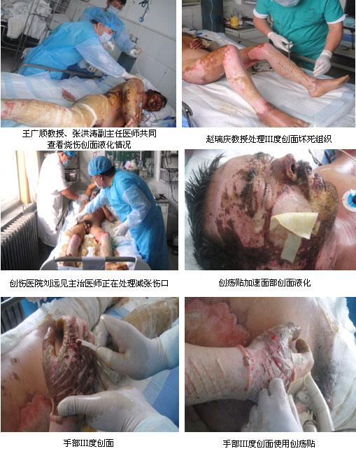 9月16日,牡丹區(qū)呂陵鎮(zhèn)某特種鋼煉鋼廠工人們正在翻砂澆鑄正常作業(yè),下午13:00時(shí)因翻砂磨具受潮,燒鑄鐵水后濺起的鐵水、引起蒸汽、沙粒、汽霧、把正在作業(yè)的翻砂工人馮某、霍某掀倒,導(dǎo)致2名工人大面積燒傷,事后鋼廠工友們用車將2人急送到菏澤市創(chuàng)傷醫(yī)院進(jìn)行搶救,醫(yī)院領(lǐng)導(dǎo)得知后立即開啟緊急綠色急救通道,直接由急診室轉(zhuǎn)入手術(shù)室、ICU病房,聯(lián)合組成普外科、ICU搶救小組,患者馮某:燒傷面積 80%TBSA;患者霍某:燒傷面積60%TBSA,兩名患者均為Ⅲ度燒傷創(chuàng)面各占到50% TBSA。中國中西醫(yī)結(jié)合學(xué)會(huì)燒傷專業(yè)委員會(huì)委員趙瑞慶教授、王廣順教授也在第一時(shí)間趕到搶救現(xiàn)場與該院醫(yī)生共同討論分別對2名傷員采取人性化的個(gè)體搶救方案,針對危重患者積極采取開通靜脈雙通道,抗休克、抗感染等支持療法,創(chuàng)面處理全部使用燒傷再生醫(yī)療技術(shù),Ⅲ度燒傷創(chuàng)面采用耕耘減張后,規(guī)范全程運(yùn)用再生醫(yī)療技術(shù)救治,經(jīng)過該院醫(yī)生的積極搶救,在患者入院12天后,患者的病情得到了有效地控制,較平穩(wěn)的度過了休克期、感染期、目前創(chuàng)面進(jìn)一步轉(zhuǎn)入后期處理階段。