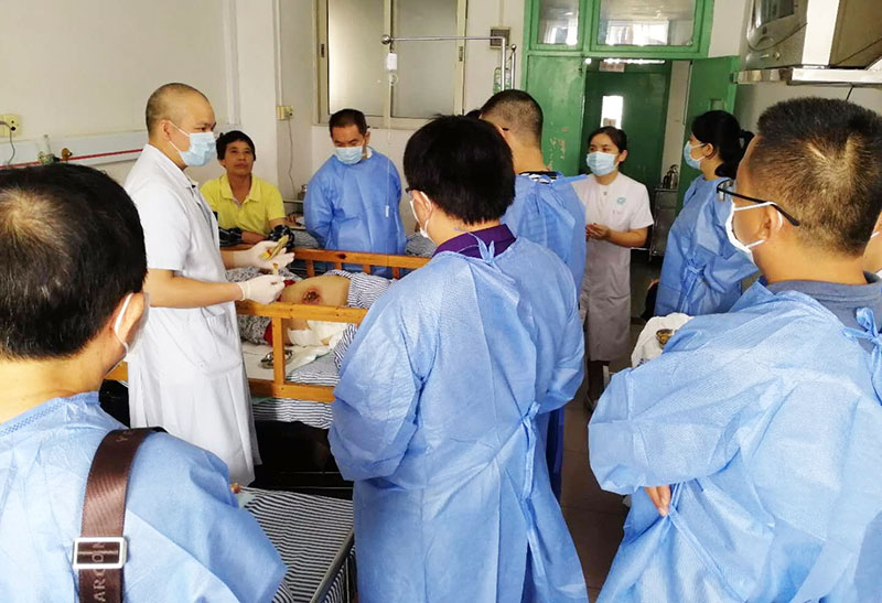醫(yī)療專家們一行首先前往燒傷與創(chuàng)面修復(fù)科病房觀摩再生醫(yī)療技術(shù)在燒傷、糖尿病足潰瘍、壓瘡等創(chuàng)面的規(guī)范化治療。病房觀摩后,各醫(yī)療專家到會議室就再生醫(yī)療技術(shù)在慢性及難愈性創(chuàng)面的規(guī)范化應(yīng)用進行了具體的學(xué)術(shù)交流及探討。就再生醫(yī)療技術(shù)在糖尿病足潰瘍、壓瘡創(chuàng)面、糖尿病足潰瘍及皮膚病的良好應(yīng)用效果進行了交流,還特別分享了再生醫(yī)療技術(shù)在眼鏡蛇咬傷創(chuàng)面的臨床處理等。