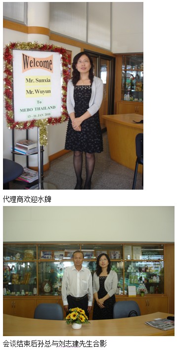 1月14日,孫總與泰國(guó)代理商劉志建先生于MEBO(Thailand)公司就泰國(guó)美寶市場(chǎng)拓展規(guī)劃進(jìn)行了親切的商務(wù)會(huì)談。雙方回顧了美寶泰國(guó)的發(fā)展歷程,劉先生深情地介紹了早年協(xié)助發(fā)展美寶的艱辛經(jīng)歷,美寶燒傷膏是泰國(guó)第一個(gè)正式注冊(cè)的中國(guó)藥品,這是美寶的驕傲,也是中國(guó)的驕傲。近幾年祖國(guó)的強(qiáng)大使所有的海外華人興奮不已,談到動(dòng)情處時(shí),擁有濃濃愛國(guó)熱情的劉先生幾度熱淚盈眶。與此同時(shí),雙方深入地分析了多年來(lái)泰國(guó)美寶發(fā)展緩慢的狀況,并確定了下一步總體發(fā)展的發(fā)向和思路。此次高層會(huì)晤進(jìn)一步提升代理商對(duì)美寶總體海外規(guī)劃及技術(shù)產(chǎn)品的高度認(rèn)可和理解,在技術(shù)產(chǎn)品發(fā)展理念、經(jīng)銷商經(jīng)營(yíng)掌控等方面達(dá)成了多項(xiàng)共識(shí)。