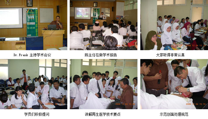 七、2008年11月27,我們再次回到Jakarta City。上午,我們到Pusdiskes Army Medical Training Center(印度尼西亞軍醫(yī)培訓(xùn)中心),對來自全國20多家部隊醫(yī)院的60多名外科醫(yī)師和全科醫(yī)師進(jìn)行了再生醫(yī)學(xué)技術(shù)培訓(xùn),大家教授培訓(xùn)后都非常激動,表示等集中培訓(xùn)結(jié)束回到醫(yī)院后一定將再生醫(yī)學(xué)技術(shù)應(yīng)用在臨床工作中,使更多的患者得到良好的康復(fù)。下午,我們趕到Islam Hospital會診和指導(dǎo)小兒燒傷的治療,效果良好。