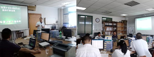 會議在下午3:00分在該科教研室兼辦公室舉行,黃武全主任主持學(xué)術(shù)會議,戴衛(wèi)平副院長參加了會議,該科普外科、肛腸科、骨科、燒傷外科學(xué)組醫(yī)護(hù)人員認(rèn)真聆聽了此次培訓(xùn)。王主任的專題學(xué)術(shù)報(bào)告分為三部分,在第一部分概述中,王主任重點(diǎn)講述了我國著名生命科學(xué)家、醫(yī)學(xué)家徐榮祥教授近年來在人體再生復(fù)原科學(xué)研究領(lǐng)域所取得的重大臨床及實(shí)驗(yàn)研究成果,2012年分別發(fā)表在《英國外科雜志》和《國際燒傷雜志》2篇綜述中有關(guān)磺胺嘧啶銀及含銀敷料等外用銀制劑用于急性創(chuàng)傷和燒傷創(chuàng)面會造成創(chuàng)面愈合延遲、增加疼痛和感染率的最新觀點(diǎn),以及再生復(fù)原療法的概念及其解決難愈性創(chuàng)面治療的機(jī)理;第二部分重點(diǎn)介紹了再生復(fù)原療法創(chuàng)面規(guī)范的處理方法;第三部分重點(diǎn)講述了再生復(fù)原療法在各類難愈性創(chuàng)瘍創(chuàng)面治療要點(diǎn)及典型病例介紹,并結(jié)合大量的病例圖片講解了各類深度燒傷創(chuàng)面、再生醫(yī)療技術(shù)在骨外露、鋼板外露、糖尿病足、動脈閉塞癥、撕脫傷、斷肢再生、手術(shù)切口感染、褥瘡等各種難愈合創(chuàng)面的治療過程及要點(diǎn)。會議持續(xù)到近6點(diǎn)才結(jié)束。戴院長代表醫(yī)院對王主任的到來表示感謝,并表示受益匪淺,王主任的講座進(jìn)一步加深了該院對原位再生技術(shù)的認(rèn)識,他們表示將在臨床中更加規(guī)范的使用該項(xiàng)技術(shù),為患者造福!