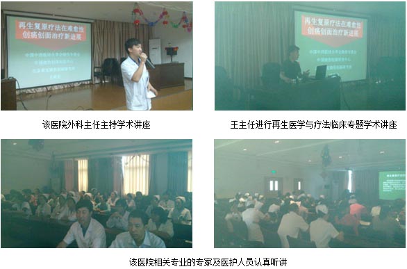 當(dāng)日下午3點,培訓(xùn)活動準(zhǔn)時在該醫(yī)院多功能會議廳舉行,該醫(yī)院外科主任主持了學(xué)術(shù)講座,在學(xué)術(shù)講座中王主任首先向與會醫(yī)護人員介紹了我國著名生命科學(xué)家、醫(yī)學(xué)家徐榮祥教授在人體再生復(fù)原科學(xué)領(lǐng)域取得的實驗及臨床研究最新進展,在2010年年底公布的“人體生命延續(xù)之謎(二)——線粒體主導(dǎo)日常生命”,破解了“精、氣、神、力”旺盛與人體啟動了再生生命程序有關(guān),與細胞內(nèi)各主要細胞器功能的發(fā)揮有關(guān),并進一步證實了一個生命體可以同時具有“基本生命”和“再生生命”等,然后結(jié)合了大量的臨床病例圖片,主要針對不同深度的燒傷創(chuàng)面及各類難愈性創(chuàng)傷、潰瘍創(chuàng)面的規(guī)范化處理方法與技巧、注意事項及其各種原因引起的骨外露的治療方案等進行了細致地講解,并向?qū)W員展示了骨科創(chuàng)瘍創(chuàng)面清創(chuàng)、骨髓開窗術(shù)、糖尿病足合并壞死性筋膜炎早期清創(chuàng)術(shù)、微粒皮種植術(shù)等創(chuàng)面規(guī)范處理示范錄像資料,并且詳細解答了醫(yī)護人員提出的各種提問。學(xué)術(shù)講座一直持續(xù)到當(dāng)日下午18:00才結(jié)束。講座中與會人員認真聽講,學(xué)習(xí)氣氛濃厚,達到了進一步推廣皮膚再生復(fù)原療法臨床應(yīng)用的目的。