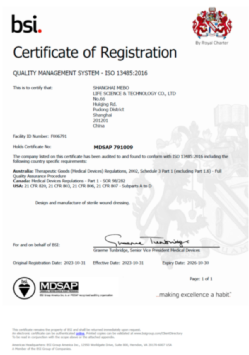 近日,上海美寶生命科技有限公司榮獲由國(guó)際權(quán)威公告機(jī)構(gòu)BSI所頒發(fā)的MDSAP認(rèn)證。認(rèn)證范圍包括了無菌創(chuàng)面敷料的研發(fā)設(shè)計(jì)與生產(chǎn)。該項(xiàng)認(rèn)證的獲得進(jìn)一步提升了美寶產(chǎn)品競(jìng)爭(zhēng)力,加強(qiáng)了國(guó)際市場(chǎng)運(yùn)作能力,提高了質(zhì)量管理與風(fēng)險(xiǎn)控制的要求。